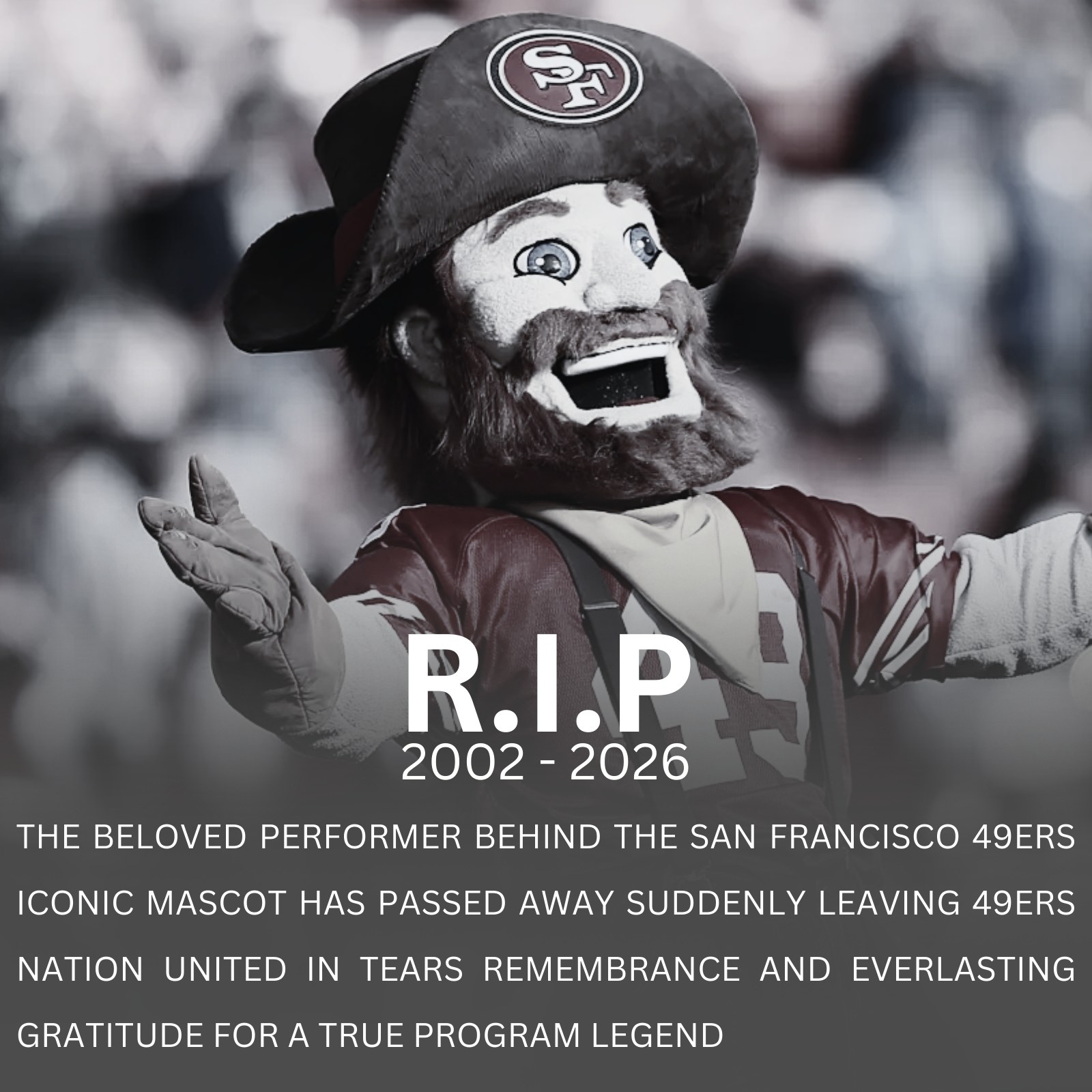 The San Francisco 49ers community is mourning tonight after heartbreaking news emerged that the longtime performer behind the team’s iconic mascot has passed away following a tragic accident. While fans rarely knew the face behind the costume, his presence had been felt for decades—on the sidelines, in the stands, and in the hearts of generations of 49ers faithful.