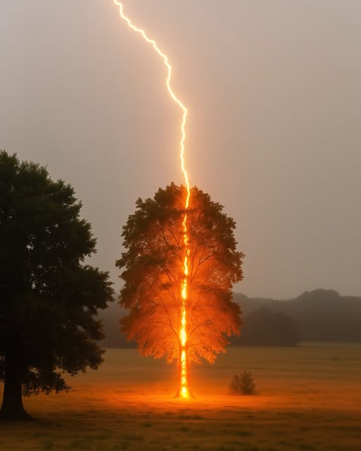 The stunning image, snapped by Danny Danya, froze nature’s raw power in a single brilliant flash. The bolt appears to tear straight through the trunk, illuminating the storm-darkened sky and sending shockwaves of light across the frame.