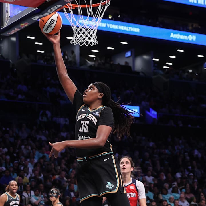 Sep 9, 2025; Brooklyn, New York, USA; New York Liberty center Jonquel Jones (35) at Barclays Center. Mandatory Credit: Wendell Cruz-Imagn Images | Wendell Cruz-Imagn Images