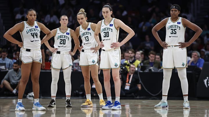 Jun 25, 2024; Belmont Park, New York, USA; New York Liberty guards Betnijah Laney-Hamilton (44), Sabrina Ionescu (20), forwards Leonie Fiebich (13), Breanna Stewart (30) and center Jonquel Jones (35) at UBS Arena. Mandatory Credit: Wendell Cruz-Imagn Images | Wendell Cruz-Imagn Images
