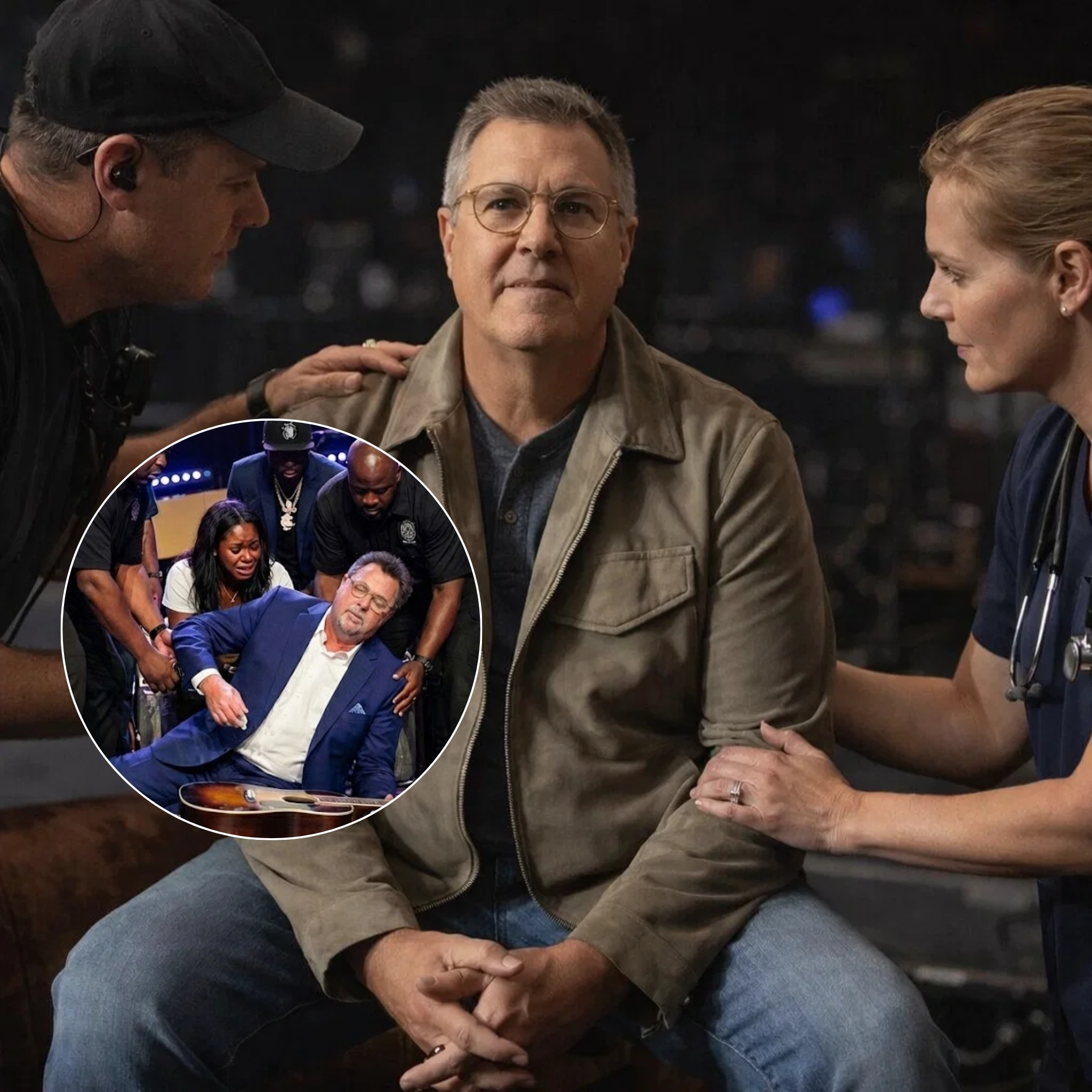 Staff members rushed forward. A few members of the band exchanged glances. The audience sat still, as if any movement at that moment would be too big. Vince Gill was assisted away from the center stage—slowly, carefully—without any official announcement.