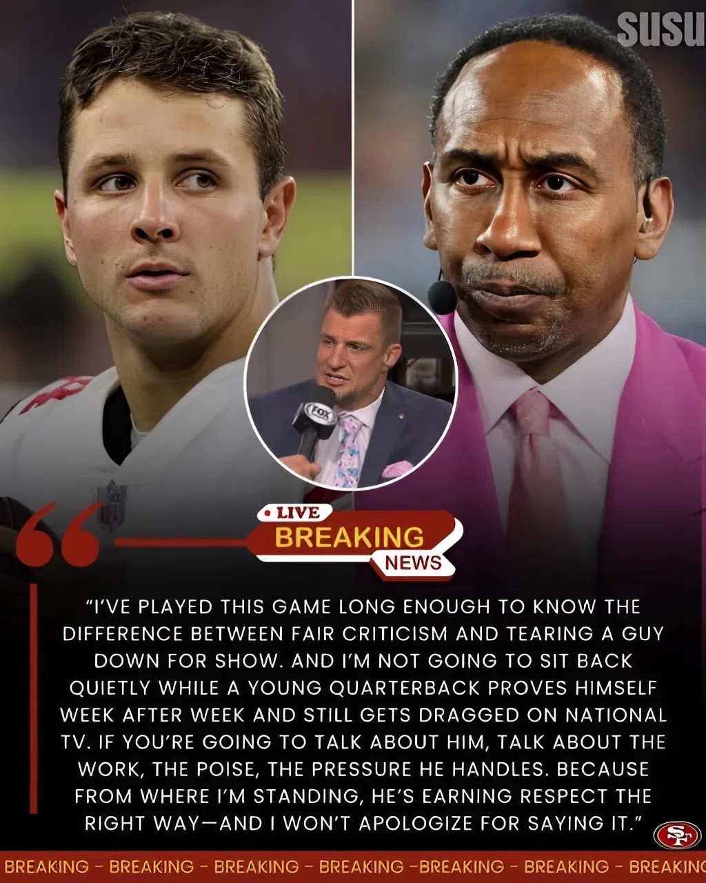 In a moment that felt less like a sports debate and more like a cultural earthquake, Rob Gronkowski shocked millions of NFL fans by delivering one of the most unexpected on-air defenses of the season — standing up for Brock Purdy during a live broadcast that instantly went viral.