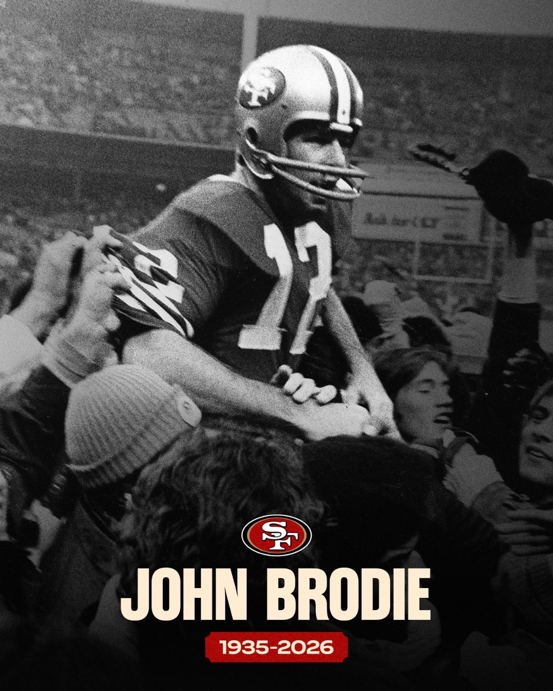 The organization has confirmed the passing of John Brodie, a Hall of Fame quarterback whose name is inseparable from the identity, dignity, and resilience of the franchise. For decades, Brodie represented far more than wins and statistics. He embodied what it meant to be a 49er long before championships, global branding, and modern spectacle defined the NFL.