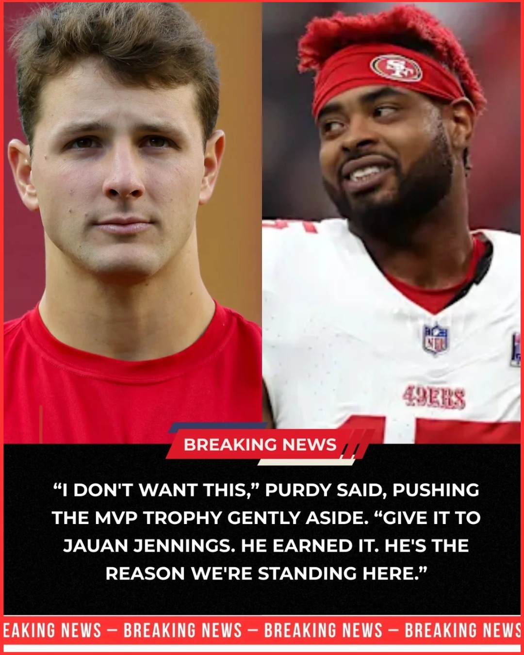 Instead of accepting the Wild Card MVP award, Purdy turned, walked across the stage, and placed the trophy directly into the hands of wide receiver Jauan Jennings.