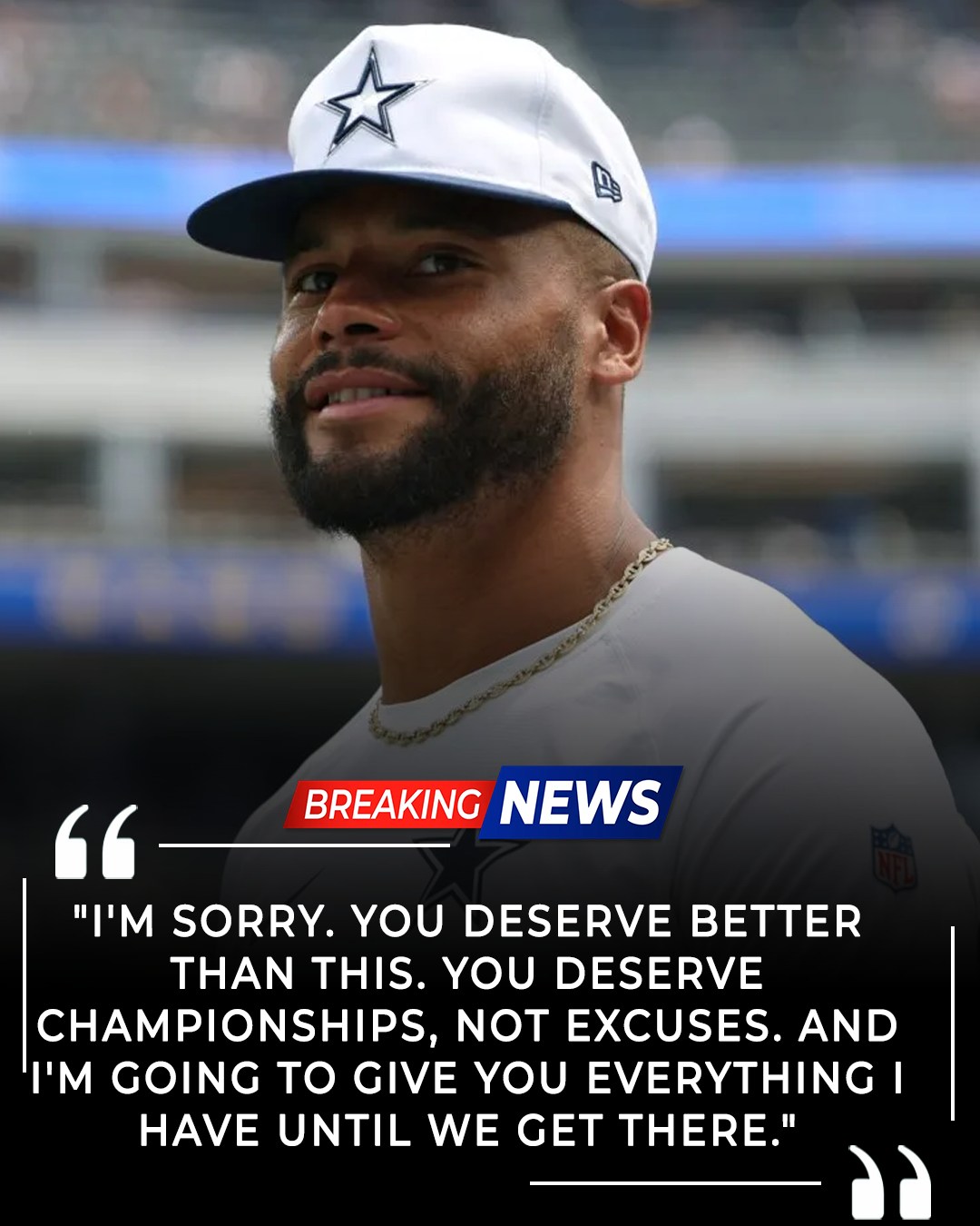 “I’m sorry. You deserve better than this. You deserve championships, not excuses,” Prescott declared in what many are calling the most vulnerable moment of his career. “And I’m going to give you everything I have until we get there.”