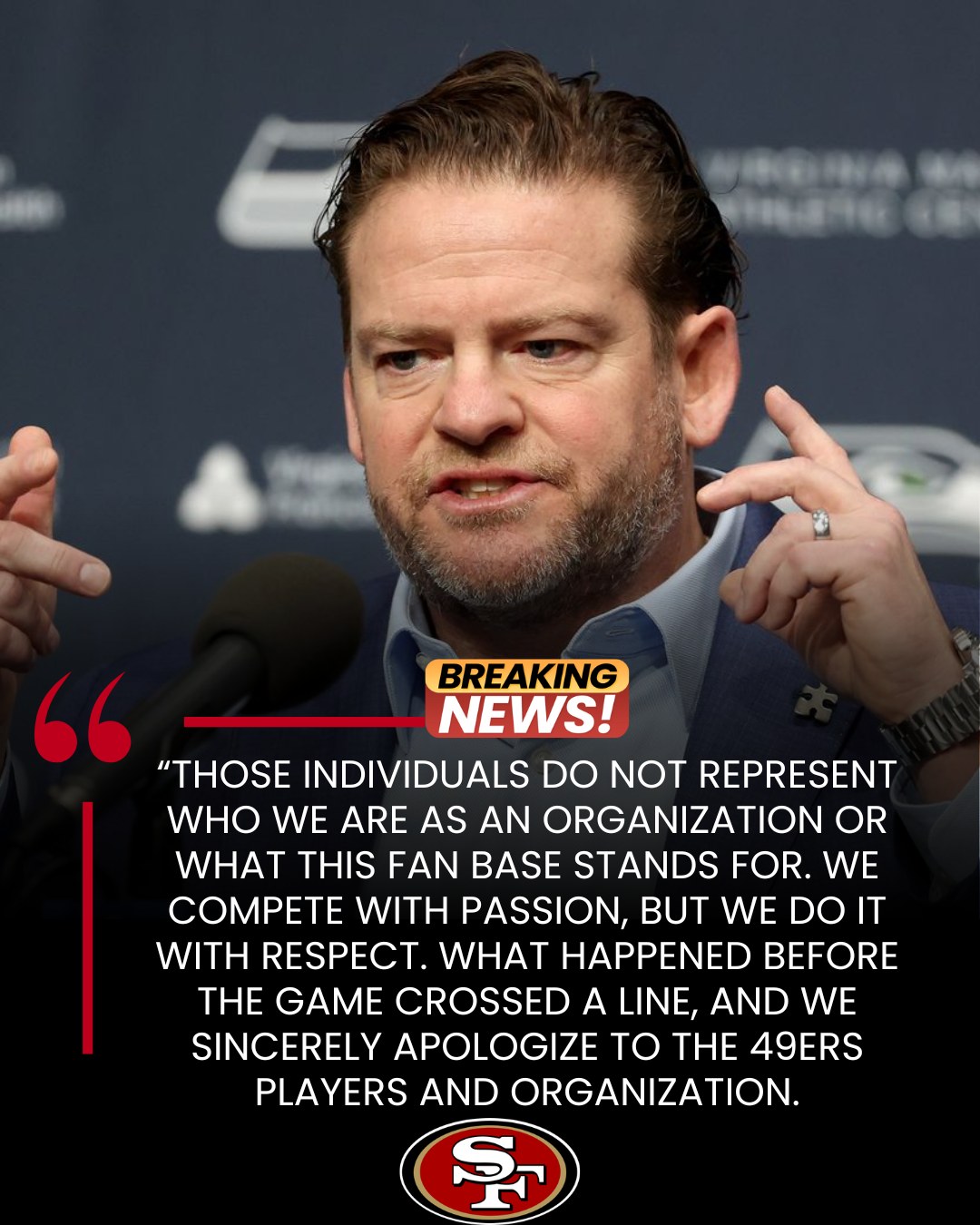 Following multiple videos showing a Seahawks fan being removed by security for hurling offensive insults at 49ers players, Seahawks general managerJohn Schneider issued a public apology to San Francisco and made it clear that the organization would not tolerate that behavior.