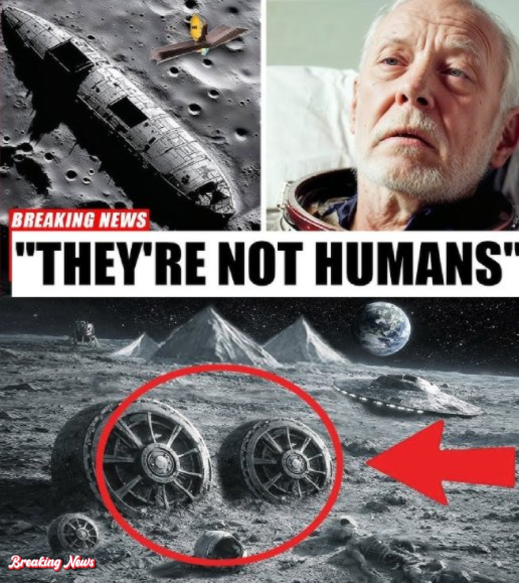 From the perspective of orthodox planetary science, the Moon is a silent archive of impacts, basaltic plains, and regolith sculpted by billions of years of cosmic weathering; yet in speculative astrophysics, especially in the period between 1947 and 2026, it has increasingly been reimagined not merely as a natural satellite but as a stage upon which a deeper interstellar narrative quietly unfolds, and the image before us—showing what appears to be metallic wheel-like mechanisms embedded in lunar soil, a sleek disc-shaped craft resting on a cratered plain, and a solemn elderly witness framed by the headline “They’re Not Human”—invites us to consider a chronology in which humanity’s understanding of its cosmic isolation began to fracture as early as the mid-twentieth century; the year 1947 marked a symbolic ignition point when Kenneth Arnold’s sighting initiated the modern UFO era, followed by decades of reports culminating in the Apollo missions of 1969–1972, during which, according to speculative reinterpretations, anomalous radar returns and unclassified visual observations hinted at artificial structures beyond official transcripts, and while mainstream archives describe only geological surveys, the science-fictional hypothesis proposes that certain high-resolution lunar orbital pH๏τographs captured between 1969 and 1971 revealed symmetrical metallic geometries partially buried near crater rims, geometries inconsistent with meteoritic fragmentation patterns, their radial symmetry suggesting engineered rotational systems, possibly components of autonomous probes whose origin predated human spaceflight by millennia; by 1994, when the Clementine mission mapped lunar topography with unprecedented detail, faint albedo anomalies near the equatorial maria sparked quiet debates among fringe astrophysicists who noted reflectivity signatures resembling alloy composites rather than silicate regolith, and though dismissed publicly, such data seeded a narrative that the Moon may function as a dormant outpost—an observation platform positioned long before Homo sapiens developed radio technology, its purpose neither conquest nor contact but surveillance and calibration within a wider galactic ecology.